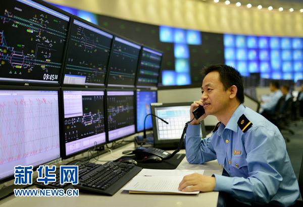 5月14日,工作人员在北京的北京铁路局调度指挥中心工作。从5月15日零时起, 全国铁路将实行新的列车运行图。此次调图,从客运市场来看,铁路部门将大量增开旅客列车。新图共安排开行旅客列车3400对,其中动车组列车2100多 对、普速列车1200多对,旅客列车较原图增加近300对。这是近10年来中国铁路实施的最大范围的列车运行图调整,也是铁路运输能力增量最大的一次调 整。新华社发(杨宝森 摄)