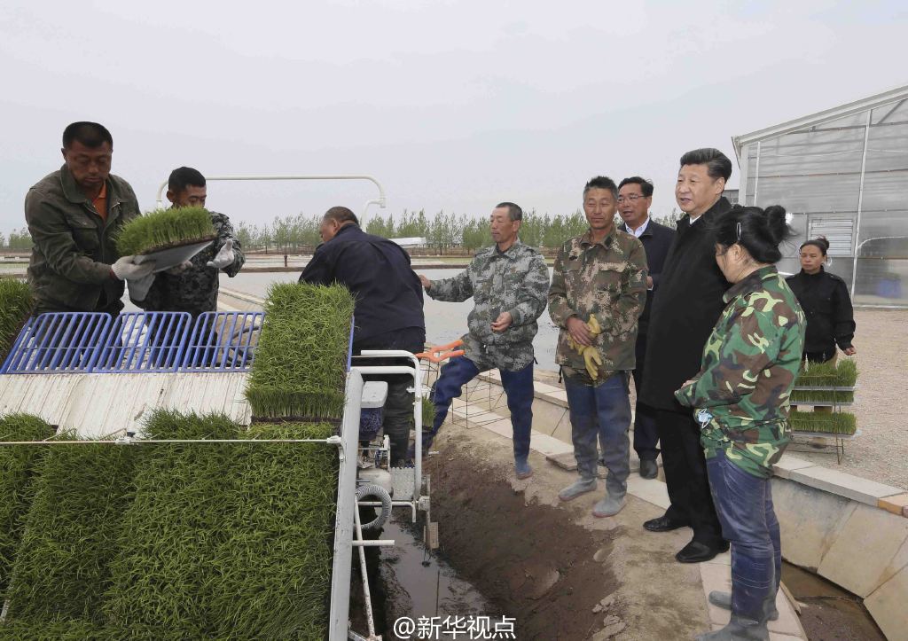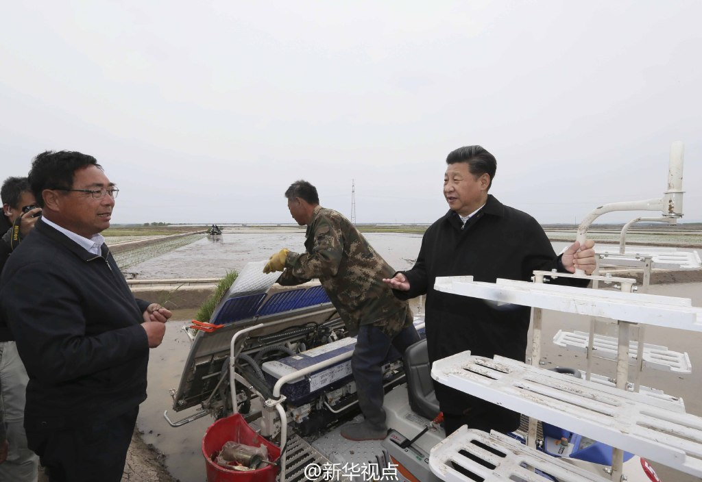 新华网北京5月25日电 24日上午,习近平来到黑龙江省抚远市玖成水稻种植专业合作社,了解合作社土地流转和采用先进种植技术提高水稻产量效益等情况。总书记登上一台自动插秧机,手扶方向盘,察看仪表盘,询问技术人员机械的工作原理、购买价格、插秧效率等。在快速育秧车间,农技人员介绍利用快速育秧设备进行超早育秧,提升稻米品质情况。总书记问:“这里种植什么品种?”“快速育苗产量能提高多少?”总书记问几位农民,合作社是什么时候成立的,土地流转后收入怎么样,还有什么打算。习近平说,黑龙江作为农业大省,保障国家粮食安全功不可没。在此基础上,要注重经济多元化发展,让农民生活水平不断提高。