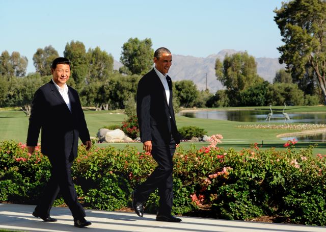 2013年6月7日,国家主席习近平与美国总统奥巴马在美国加利福尼亚州安纳伯格庄园举行中美元首会晤前共同走向媒体区合影。新华社记者饶爱民摄