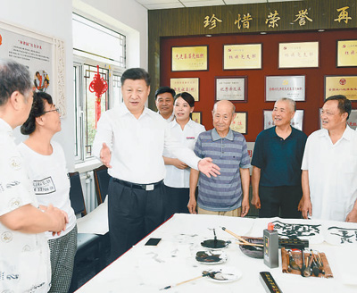 7月28日,中共中央总书记、国家主席、中央军委主席习近平到河北唐山市调研考察。这是习近平在唐山市祥富里社区文化活动室勉励正在进行书法绘画的社区居民。