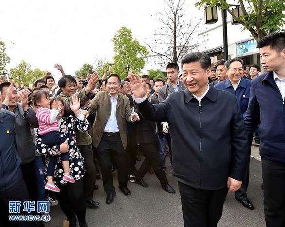 2016年4月24日至27日,中共中央总书记、国家主席、中央军委主席习近平在安徽调研。这是4月25日下午,习近平在滁州市凤阳县小岗村向村民们问好。 新华社记者李涛摄