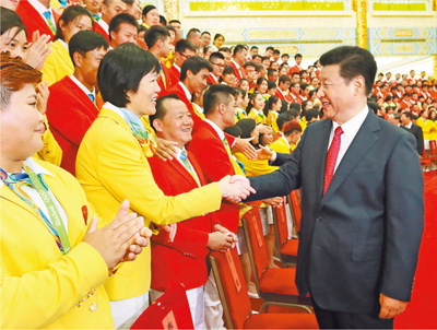 习近平强调,我们讲道路自信、理论自信、制度自信、文化自信。我们不以胜负论英雄,同时英雄就要敢于争先、敢于争第一。在奥运会这样高水平的竞争场合,争第一、拿金牌奖牌很不容易,拿到金牌奖牌的,值得尊敬和表扬。同时,只要勇于战胜自我、超越自我,即使没有拿到金牌奖牌,同样值得尊敬和表扬。所以我要说,这次拿了金牌奖牌的队伍和运动员,都是好样的。这次没拿到金牌奖牌,但在比赛中做了最好的自己的队伍和运动员,也都是好样的。中国女排不畏强手、英勇顽强,打出了风格、打出了水平,时隔12年再夺奥运金牌,充分展现了女排精神,全国人民都很振奋。我国体育健儿在里约奥运会上的表现,展示了强大正能量,展示了“人生能有几回搏”的奋斗精神。实现“两个一百年”奋斗目标、实现中华民族伟大复兴的中国梦,就需要这样的精神。要在全社会广泛宣传我国体育健儿在奥运会赛场上展现的拼搏精神,使之化为全党全国各族人民团结奋斗的强大精神力量。
