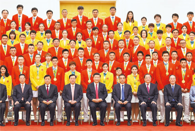 8月25日,党和国家领导人习近平、李克强、张德江、俞正声、刘云山、王岐山、张高丽等在北京人民大会堂会见第31届奥林匹克运动会中国体育代表团全体成员并合影留念。