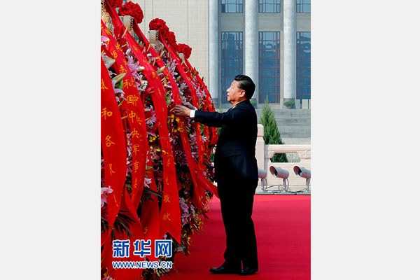习近平走上前,仔细整理花篮缎带。接着,习近平等党和国家领导人缓步绕行,瞻仰人民英雄纪念碑。