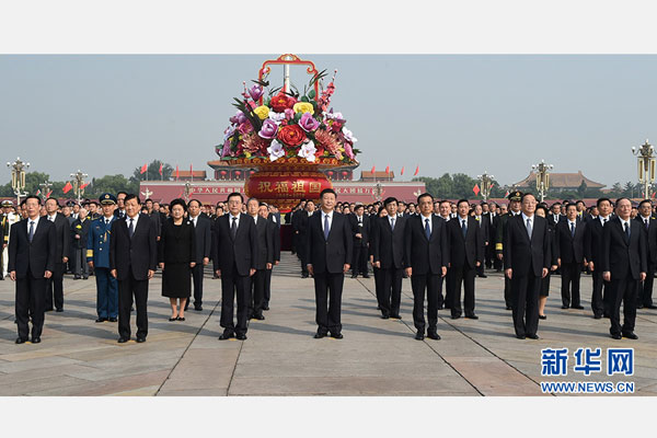 临近10时,习近平、李克强、张德江、俞正声、刘云山、王岐山、张高丽等党和国家领导人来到天安门广场,步行至群众方阵前,出席向人民英雄敬献花篮仪式。