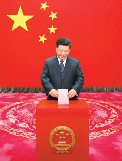 上午10时许,习近平来到怀仁堂投票站,同投票站的工作人员亲切握手,仔细听取有关选举事项的说明。习近平拿出选民证交给工作人员核验,并领取了一张选票。在写票处认真填写选票后,习近平走到票箱前郑重投下自己的一票。