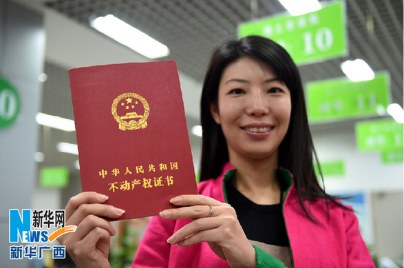 资料图。2015年3月2日,在广西南宁市政务服务中心,一家企业有关负责人在展示企业不动产权证书,这是广西颁发的全区第一本不动产权证。新华社记者 陆波岸 摄