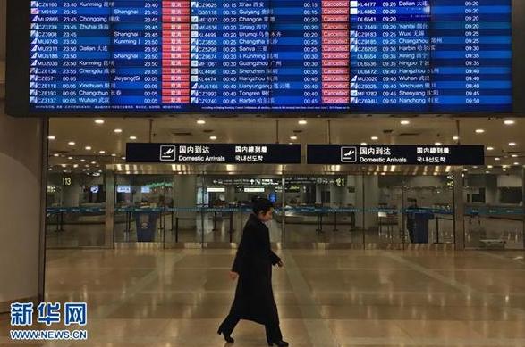 资料图。2016年12月20日,在北京首都国际机场T2航站楼,一名工作人员走过显示航班取消的电子屏幕。新华社记者 潘超越 摄