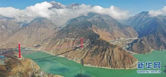 雅康高速公路泸定大渡河兴康特大桥(12月30日无人机拍摄)。兴康特大桥为全长1411米的超大跨径钢桁梁悬索桥,是雅康高速公路的控制性工程之一,被誉为“川藏第一桥”。新华社记者 江宏景摄