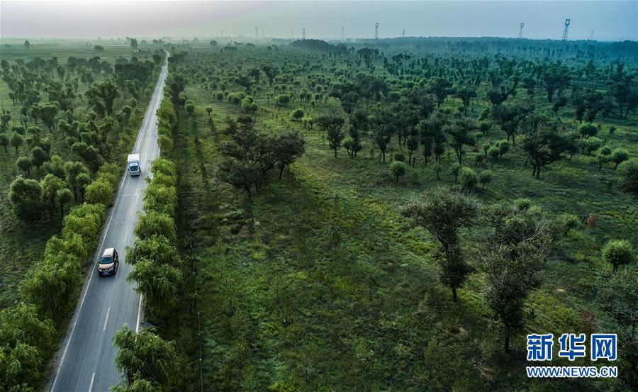 汽车行驶在陕西榆林市靖边县东坑镇新建村的道路上(2018年8月1日无人机拍摄)。陕西省开展的天然林保护工程和全面治理荒沙行动,极大改善了毛乌素的生态环境,也使沙漠南缘的陕西省榆林市实现从“沙进人退”到“绿进沙退”的转变。 新华社记者 陶明 摄