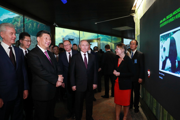 图为会谈后,两国元首共同出席莫斯科动物园熊猫馆开馆仪式。 新华社记者 丁林 摄