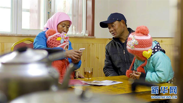 在青海省海东市互助土族自治县五十镇班彦村的易地扶贫搬迁新村,村民吕有金(右二)和老伴在新家里照顾孙女(2016年12月25日摄)。 新华社记者 王大千 摄