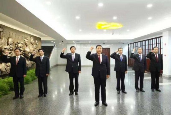 2017年10月31日,在上海中共一大会址纪念馆,习近平带领其他中共中央政治局常委同志一起重温入党誓词。 新华社记者 兰红光 摄