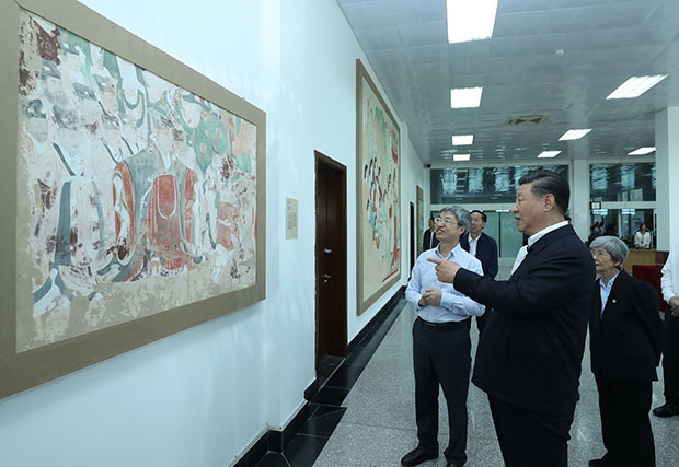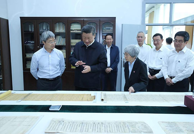 19日下午,习近平总书记在敦煌研究院同有关专家、学者和文化单位代表座谈时,甘肃省文联原副主席苏孝林谈到了《丝路花雨》《大漠敦煌》等文化作品,习近平详细询问演出市场的盈亏,谈到中华优秀文化走出去等相关情况。他强调,传统文化的弘扬我们要给予帮助,要保护好我们的国粹。敦煌文化展示了中华民族的文化自信,只有充满自信的文明才能在保持自己特色的同时包容吸收各种文明成果。今天我们要铸就中华文化新辉煌,就要以更加博大的胸怀,更加广泛地开展同各国的文化交流,更加积极主动学习借鉴世界一切优秀文明成果。他勉励文化工作者讲好敦煌故事,讲好中国故事。(文字记者:张晓松、朱基钗 摄影记者:鞠鹏、谢环驰)