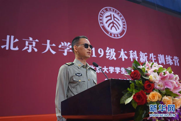 杜富国在北京大学体育馆举行的“排雷英雄战士”杜富国先进事迹报告会上作报告(9月3日摄)。 新华社记者 张永进 摄