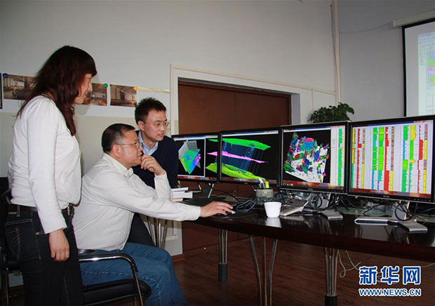 著名地球物理学家黄大年(左二)带领科研团队成员研究问题(2010年11月22日摄)。新华社发