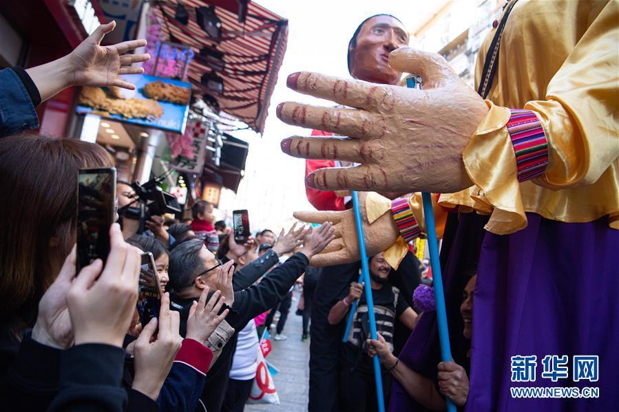 12月8日,表演者在“2019澳门国际幻彩大巡游”活动上与观众互动。 当日,庆祝澳门回归祖国二十周年“2019澳门国际幻彩大巡游”举行。新华社记者 张金加 摄