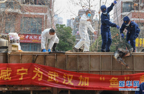 3月13日,一批运到湖北省武汉市硚口区华生汉口城市广场社区的活鱼在卸货。当日,首批100吨调配自咸宁市的活鱼运抵武汉市硚口区11个街道下辖社区。 新华社记者 程敏 摄