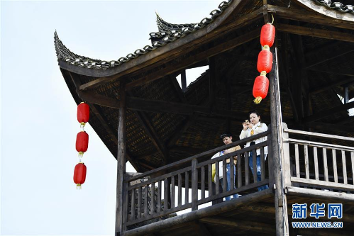 游客在重庆市武隆区黄莺乡复兴村的观景楼上欣赏田园景色(2019年3月28日摄)。 新华社记者 刘潺 摄