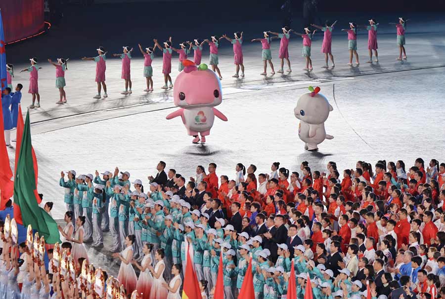 11月21日,广东省体育代表团、香港特别行政区体育代表团和澳门特别行政区体育代表团代表在闭幕式上共同入场。中国日报记者 郑尔奇 摄