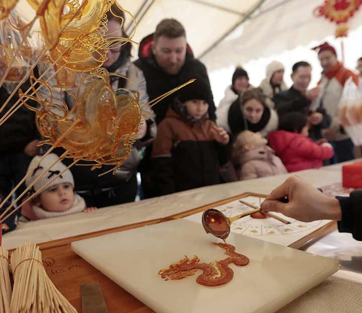 2月7日,在匈牙利首都布达佩斯举行的唐人街新春庙会上,人们观看糖画制作。新华社发(鲍洛格·拉斯洛摄)