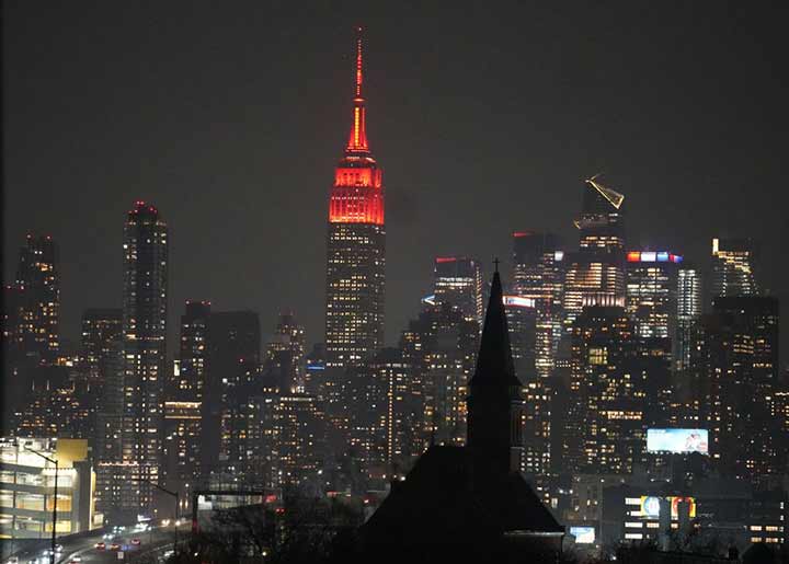 2月16日晚,美国纽约帝国大厦亮起中国春节主题灯光。新华社记者张凤国摄