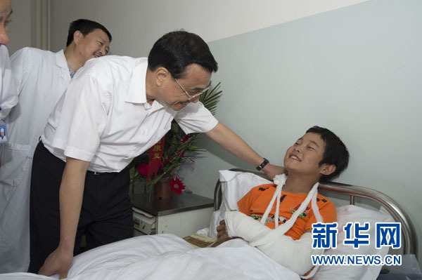 8月17日,中共中央政治局常委、国务院总理李克强来到甘肃岷县漳县地震灾区考察。 这是李克强总理在岷县医院看望胳膊受伤的曹健东小朋友。新华社记者李学仁摄