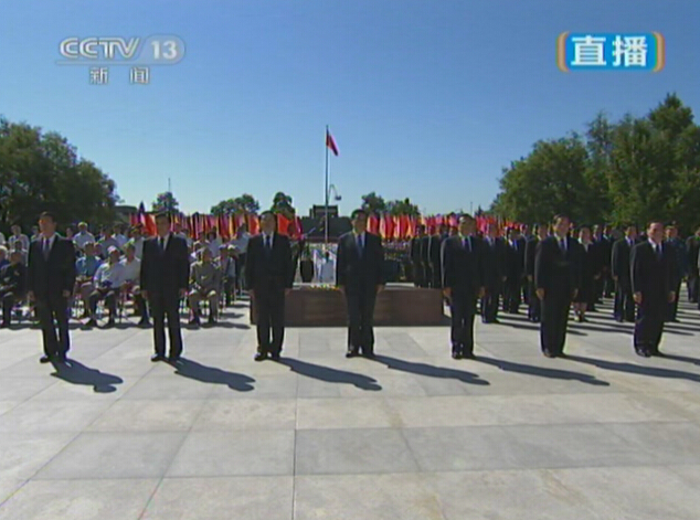 9时56分,习近平、李克强、张德江、俞正声、刘云山、王岐山、张高丽等来到这里,现场响起热烈掌声。习近平等在中国人民抗日战争纪念馆前的平台上肃立。参加过抗日战争的老战士和老同志、抗战烈士亲属、为中国人民抗日战争胜利作出贡献的国际友人遗属代表,解放军武警部队官兵代表,首都各界群众代表,排着整齐的队列面向纪念馆肃立。