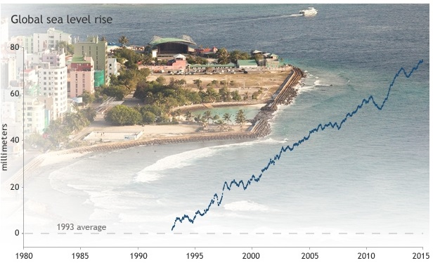 在过去的20年中,全球海平面以每年3.2毫米的速度持续上升。全球卫星系统在1993年开始记录海平面的数据,升高的趋势很明显。海潮越来越高,是气候变化最具破坏力的表现之一。世界10个最大的城市中有8座靠近海边。