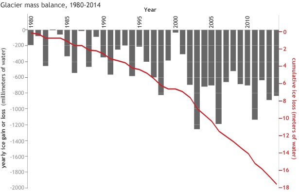 据对约40座冰川的数据监测显示,2014年是全球持续冰川消融的第31年,且速度在不断加快。冰川消融被普遍认为是气候变暖的最明显信号之一。