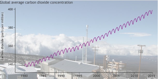 上图显示的数据来自夏威夷冒纳罗亚火山观测站。从1958年3月开始,斯克里普斯海洋研究所的基林(Charles David Keeling)就开始收集这些数据,因此本图表一般被称为“基林曲线”。